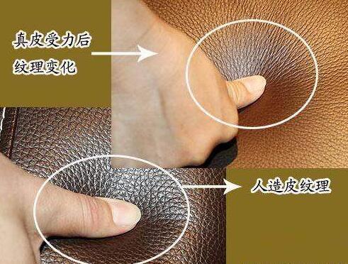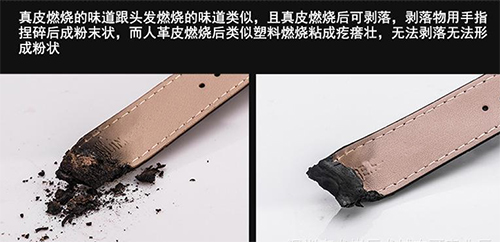 從天然革和人造革背面撕下一點纖維,點燃后,凡發出刺鼻的氣味,結成疙瘩的是人造革;凡是發出毛發氣味,燃燒物不結硬疙瘩、一捏就成粉末的是天然皮革。